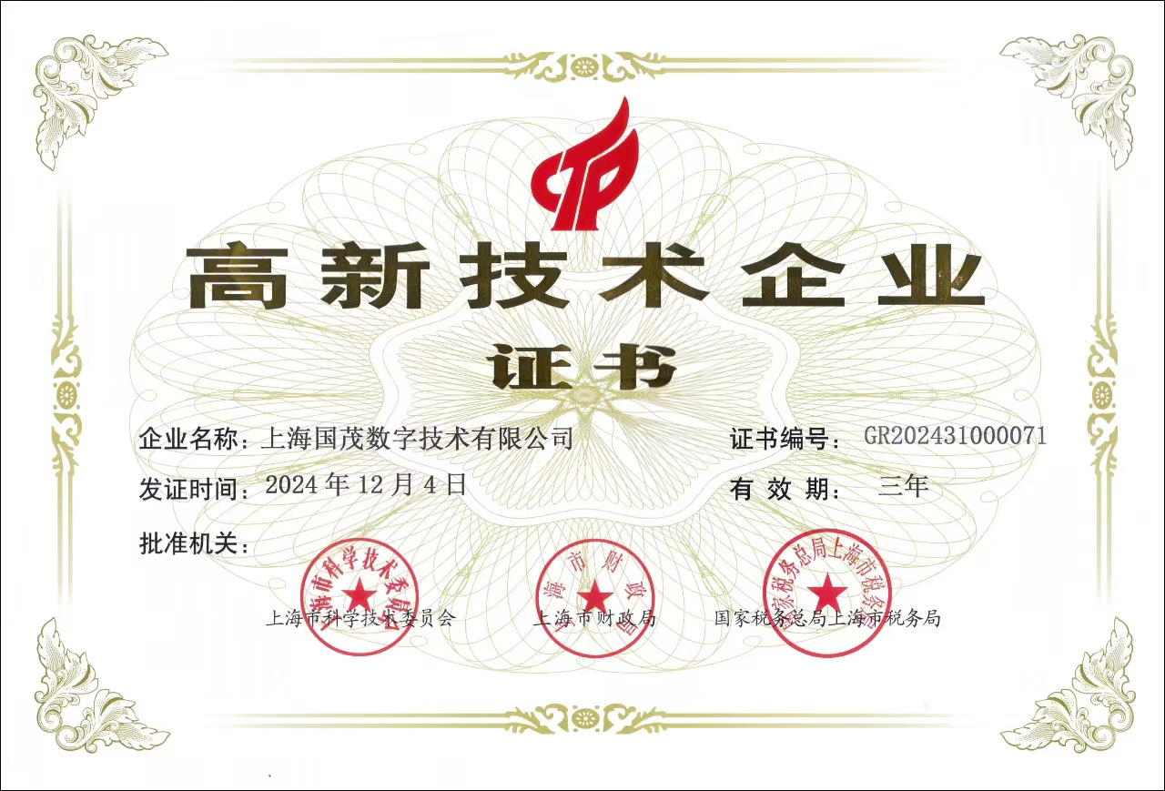上海國茂數(shù)字技術有限公司第五次通過國家高新技術企業(yè)認定(證書編號:GR202431000071)。