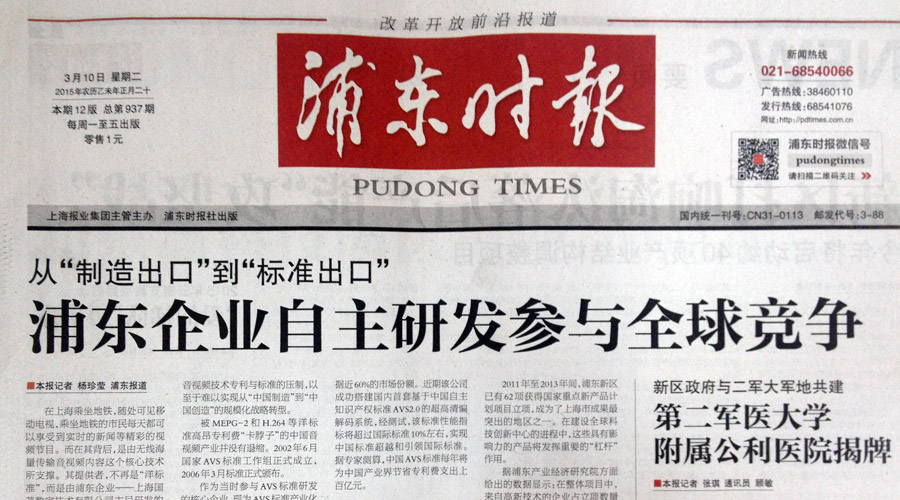 2015年3月10日,浦東時報頭版刊登《從“制造出口”到”“標準出口”浦東企業(yè)自主研發(fā)參與全球競爭》,文中重點提到上海國茂數(shù)字技術有限公司在音視頻編解碼技術方面攻克核心技術難關,最終實現(xiàn)“中國標準”替代“國際標準”并出口海外的成績。列舉了國茂“地鐵無線海量傳輸音視頻技術”“AVS編碼器出口多個海外國家”等代表性實例。