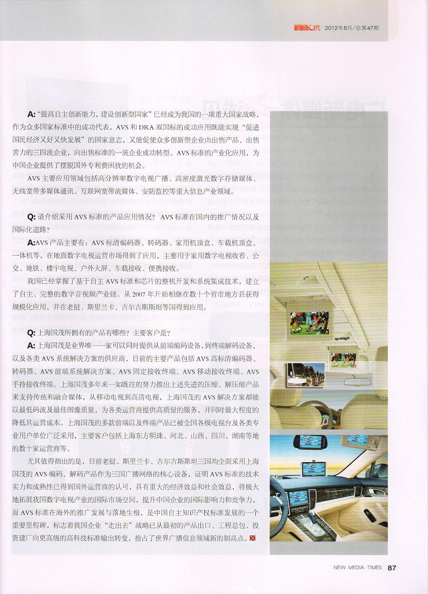 AVS+行業(yè)標(biāo)準(zhǔn)開始實(shí)施 《新媒體時(shí)代》雜志專訪國(guó)茂總經(jīng)理王國(guó)中博士 2012-08-15
