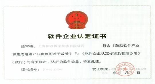經(jīng)過專家評(píng)審、網(wǎng)上公示,上海國(guó)茂數(shù)字技術(shù)有限公司獲得上海市經(jīng)濟(jì)和信息化委員會(huì)頒發(fā)的"軟件企業(yè)認(rèn)定證書",證書編號(hào):滬R-2011-0096.