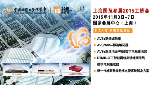第17屆中國國際工業(yè)博覽會于2015年11月3--7日在上海國家會展中心舉行。上海國茂數(shù)字技術(shù)有限公司在科技創(chuàng)新展區(qū)展示并介紹AVS標(biāo)準(zhǔn)產(chǎn)業(yè)化應(yīng)用成果。 自2002年國家工信部啟動中